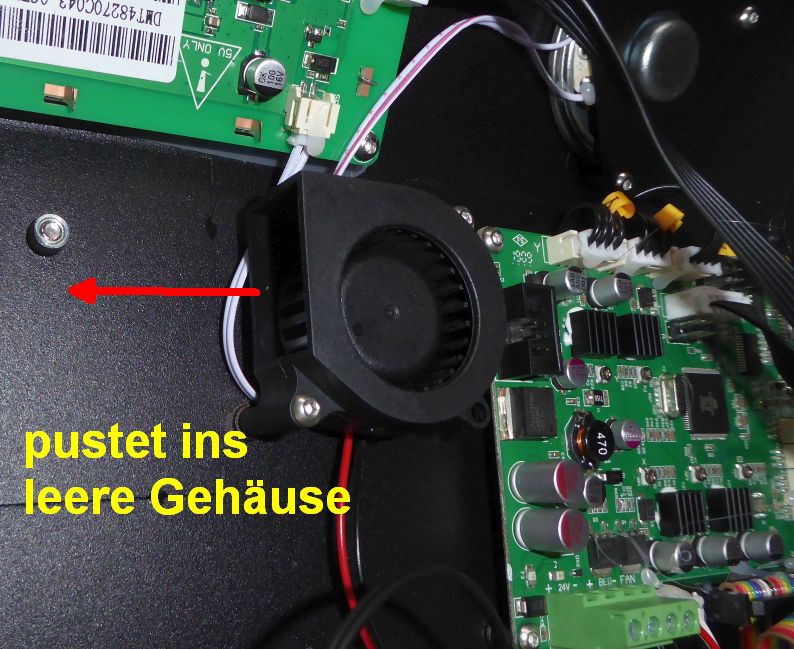 Der Lüfter für das Board war verkehrt herum installiert. Blies ins Leere statt auf die Treiberkühlkörper.