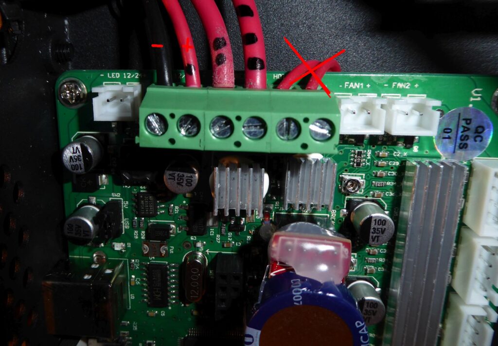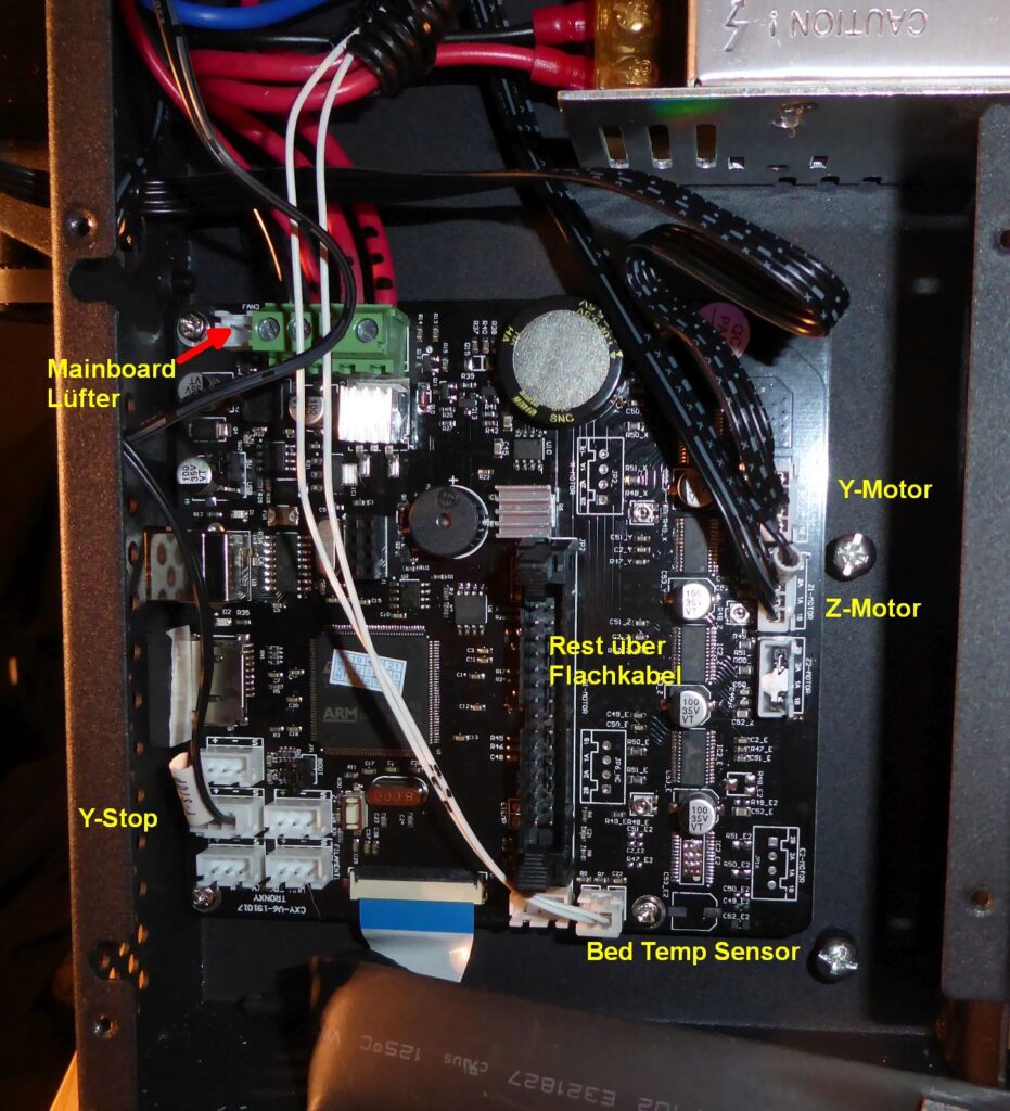 Y-Stop, Y-Motor, Z-Motor, Mainboardlüfter und Bed TempSensor eingesteckt