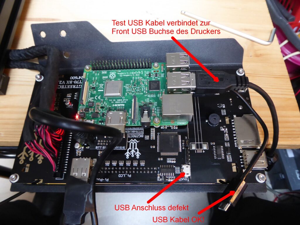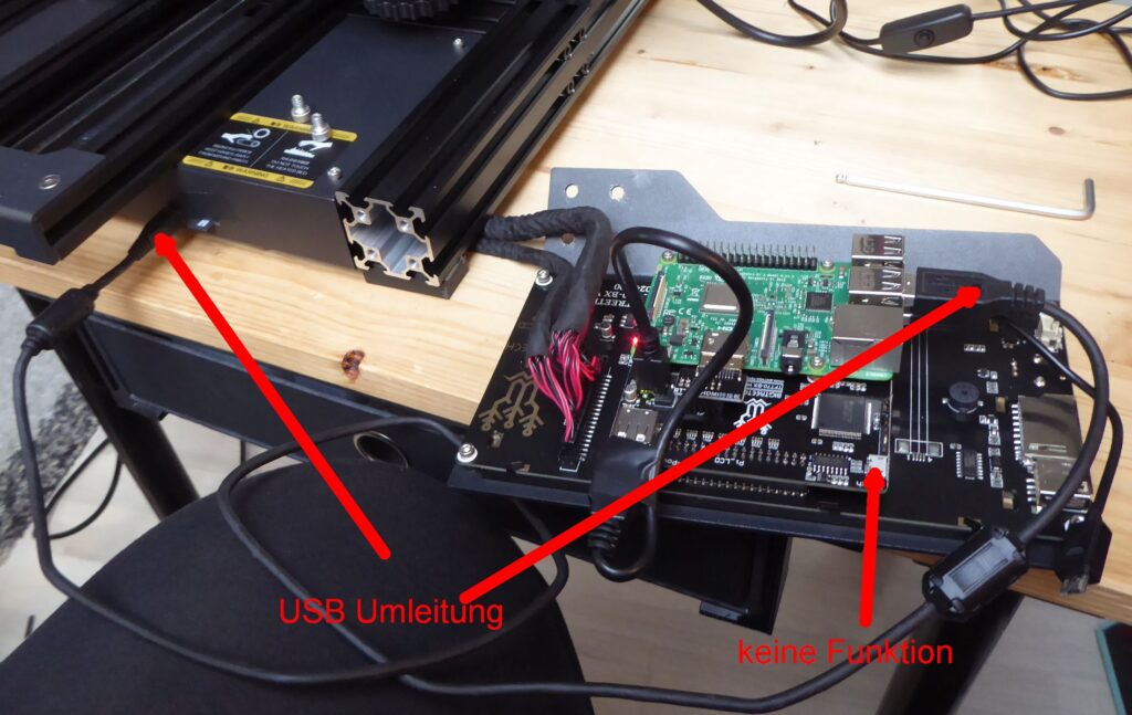 Es könnte auch sein, dass es mit Raspi 4 und Octopi 0.17 klappt, habe aber keine Lust mehr das zu testen, da USB Kabel Umleitung zur Front auf jeden Fall nötig ist.