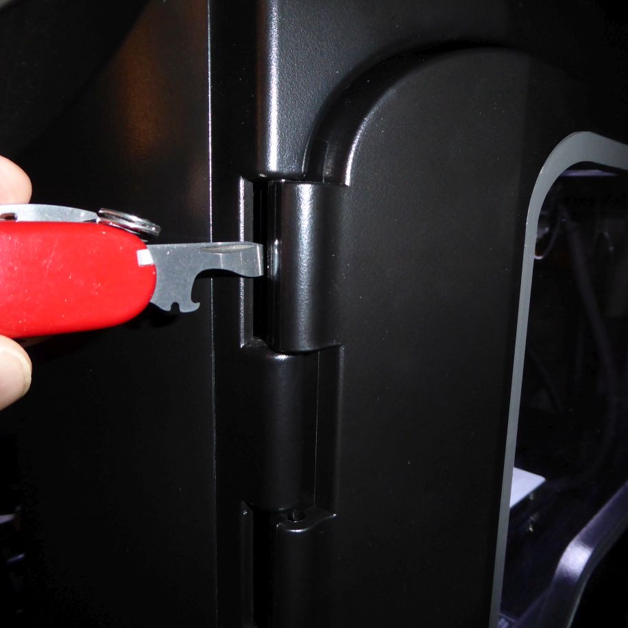 Einen breiten Schraubenzieher o.ä. zwischen Gehäuse und Türscharnier ansetzen und durch drehen aushebeln. Beim Einsetzen schnappt das Scharnier einfach wieder ein.