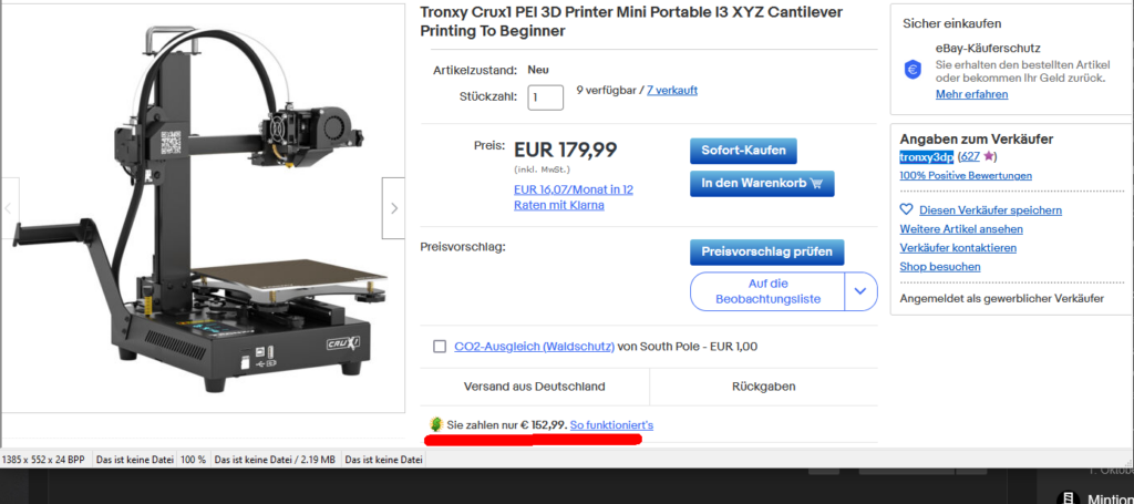 Auf Ebay gibt es ihn noch etwas günstiger für 179,- und sogar ein Angebot für 152,99 wenn man den Verkäufer tronxy3dp sucht (bis 30.10.2022)