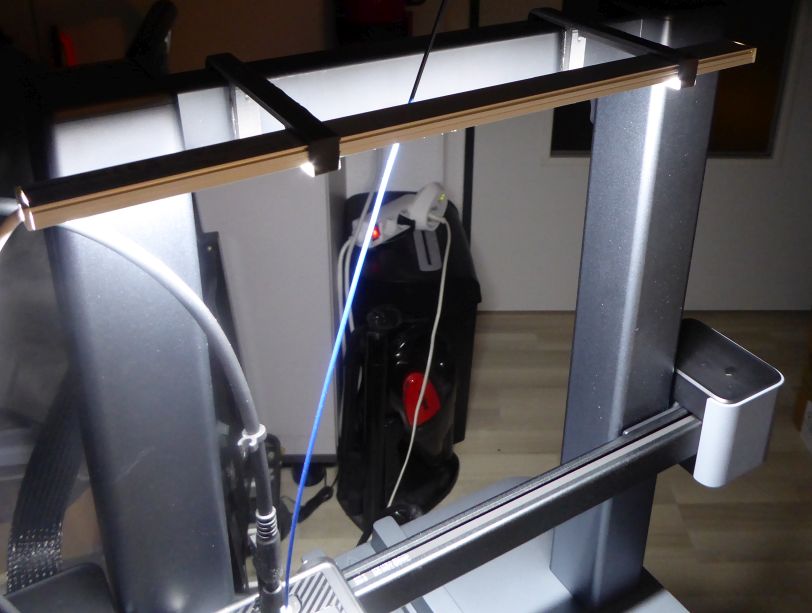 Die Lampe an der Stelle ist allerdings keine gute Idee bei sehr hohen Druckobjekten. Dann stößt das Kabel vom Druckkopf an. Entweder muss man dann das Kabel hinter die linke Säule führen, oder die Lampe an anderer Stelle installieren, (Halter nach hinten zeigen lassen)
